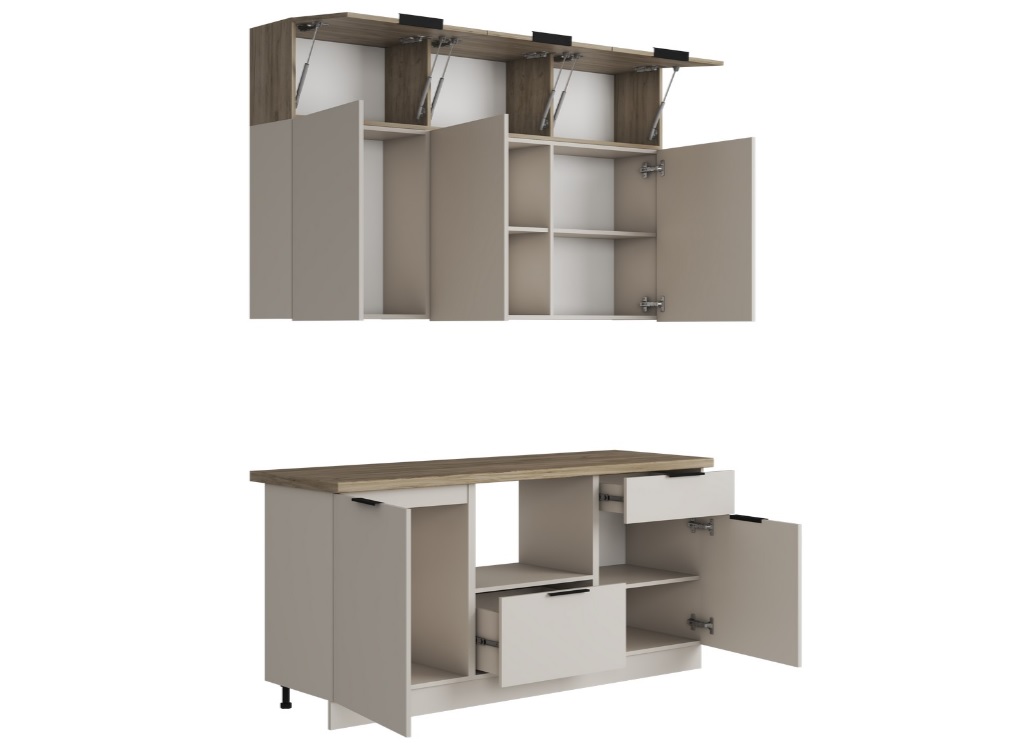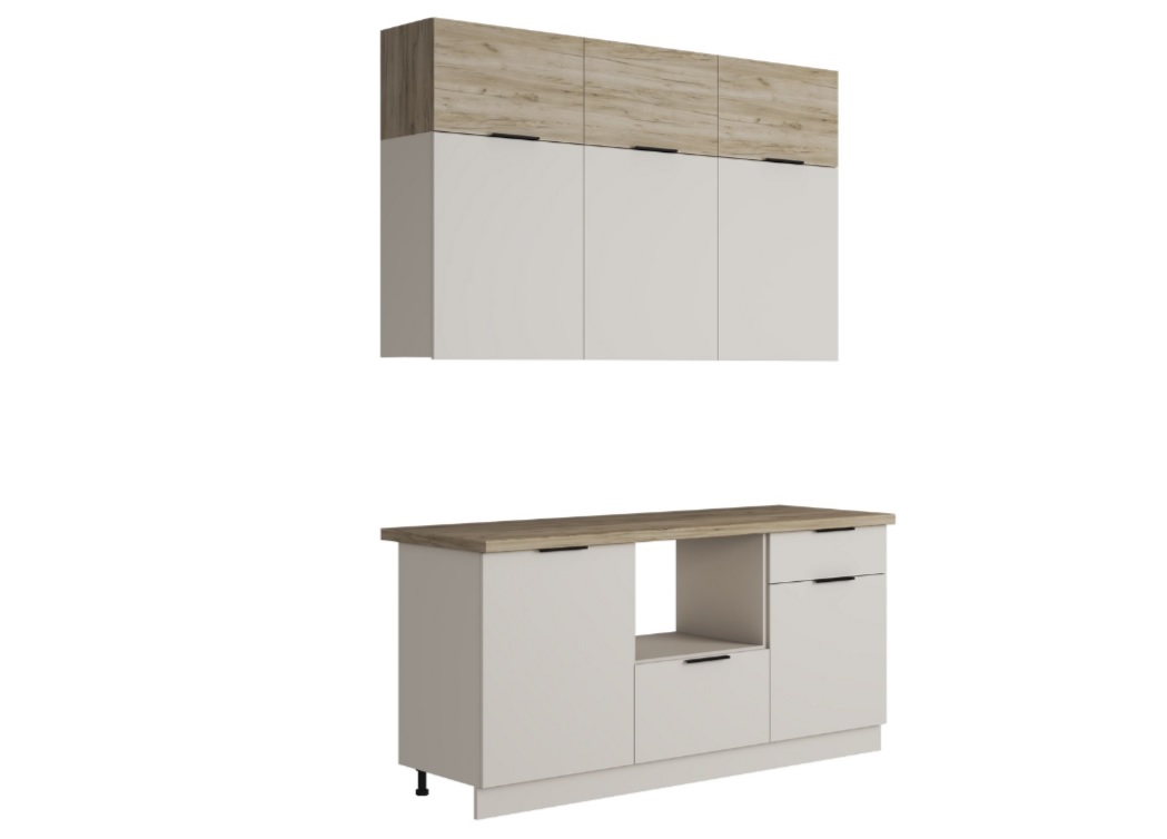 2. Цветовая гамма: Фасад и корпус БОХО Кухня 1,8 м. имеет единое цветовое решение и выпускается в одном цветовом сочетании: Корпус/Фасад ЛДСП – Кашемир (Столы и навесные шкафы) Корпус/ Фасад ЛДСП – Дуб Крафт серый (Антресоль)