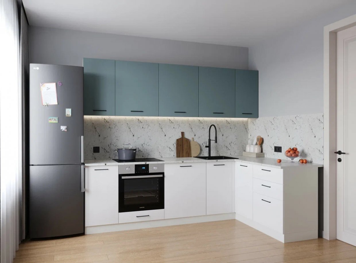 • Фасады со свесом – дают возможность использовать верхние модули без установки ручек, а также установить скрытую подсветку